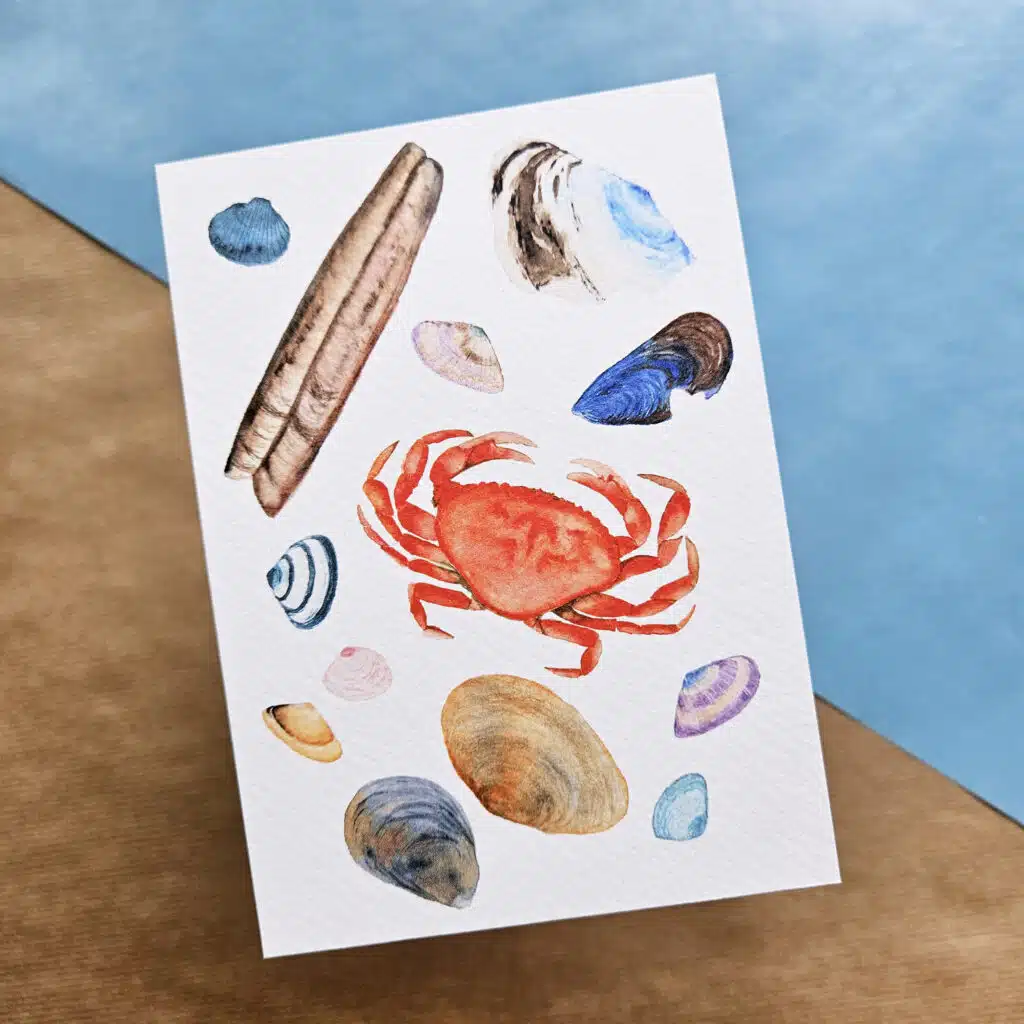 Wenskaart met print van een aquarel illustratie van schelpen en een krab.