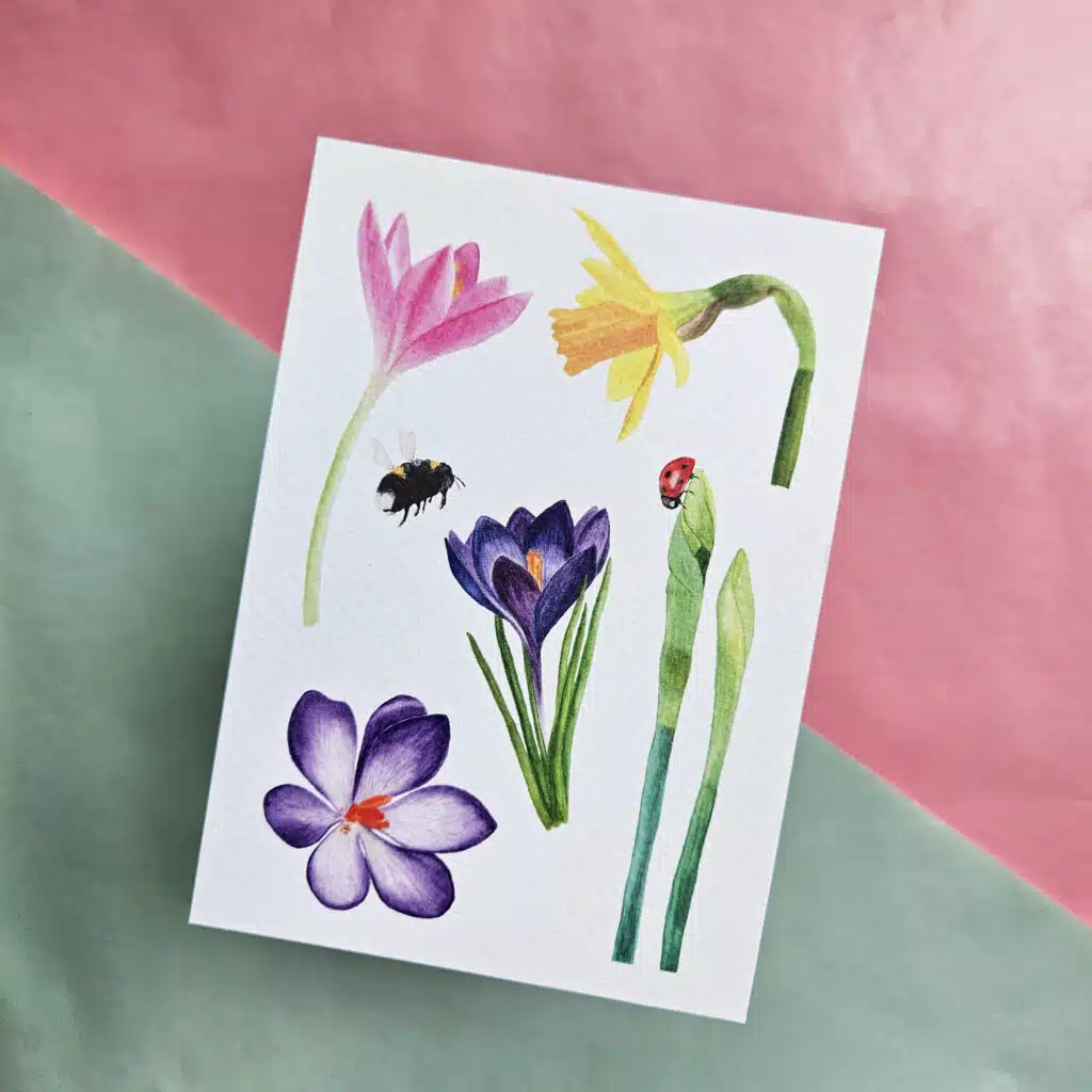 Wenskaart met print van een aquarel illustratie van narcissen en krokussen.