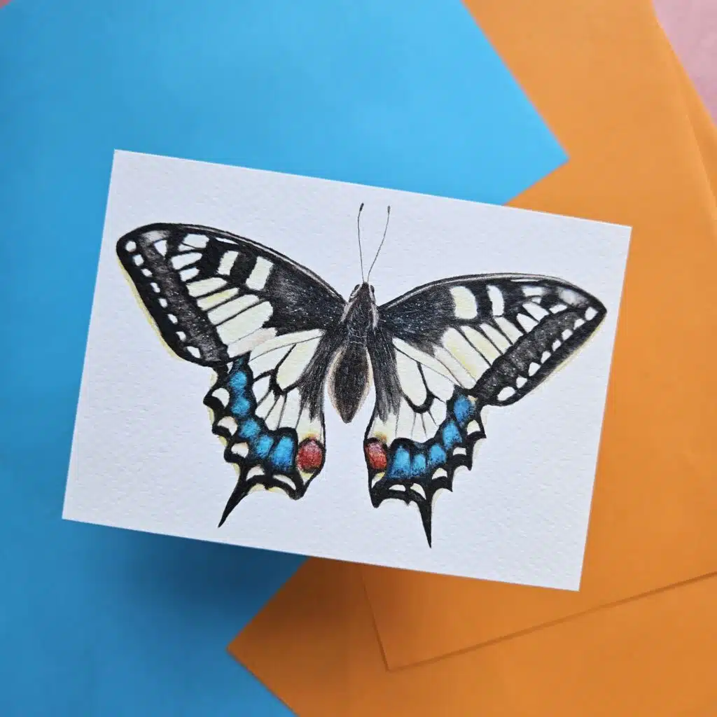 De aquarel illustratie die ik maakte van deze koninginnenpage is op hoge resolutie gedigitaliseerd en vervolgens gedrukt op stevig 350 grams Tintoretto Gesso; een mooie ongestreken papiersoort met een klein structuurtje. Deze soort is vrij wit, maar niet helemaal hoogwit. Daardoor komen de kleuren mooi uit. De structuur is een beetje geschept en erg subtiel, waardoor deze papiersoort een unieke en luxe uitstraling krijgt. Tintoretto Gesso is FSC gecertificeerd.