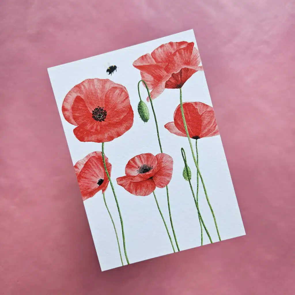 Wenskaart met print van een aquarel illustratie van klaprozen