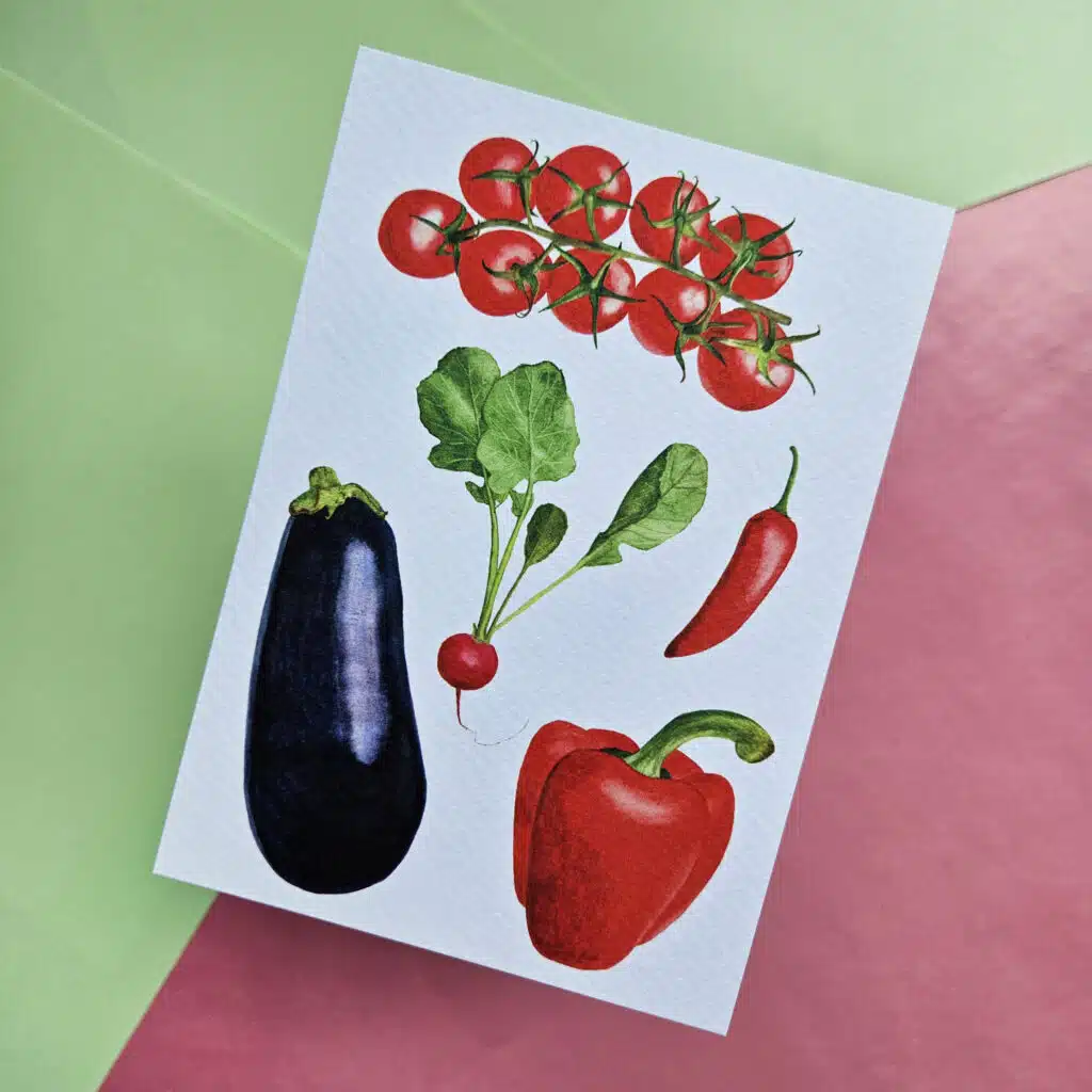 De aquarel illustratie die ik maakte van deze groente is op hoge resolutie gedigitaliseerd en vervolgens gedrukt op stevig 350 grams Tintoretto Gesso; een mooie ongestreken papiersoort met een klein structuurtje. Deze soort is vrij wit, maar niet helemaal hoogwit. Daardoor komen de kleuren mooi uit. De structuur is een beetje geschept en erg subtiel, waardoor deze papiersoort een unieke en luxe uitstraling krijgt. Tintoretto Gesso is FSC gecertificeerd.