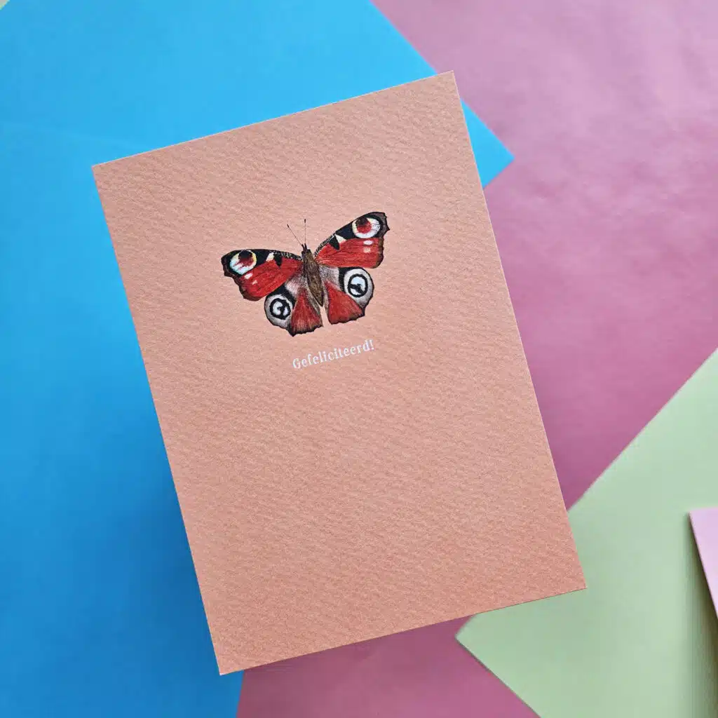 Wenskaart met print van een aquarel illustratie van een vlinder en de tekst ‘gefeliciteerd!’.
