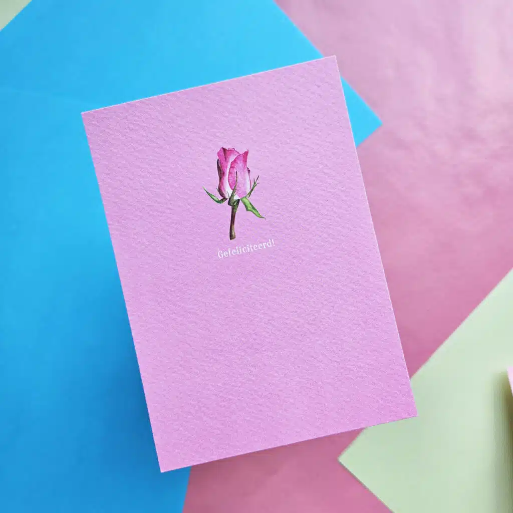 Wenskaart met print van een aquarel illustratie van een roosje en de tekst ‘gefeliciteerd!’.