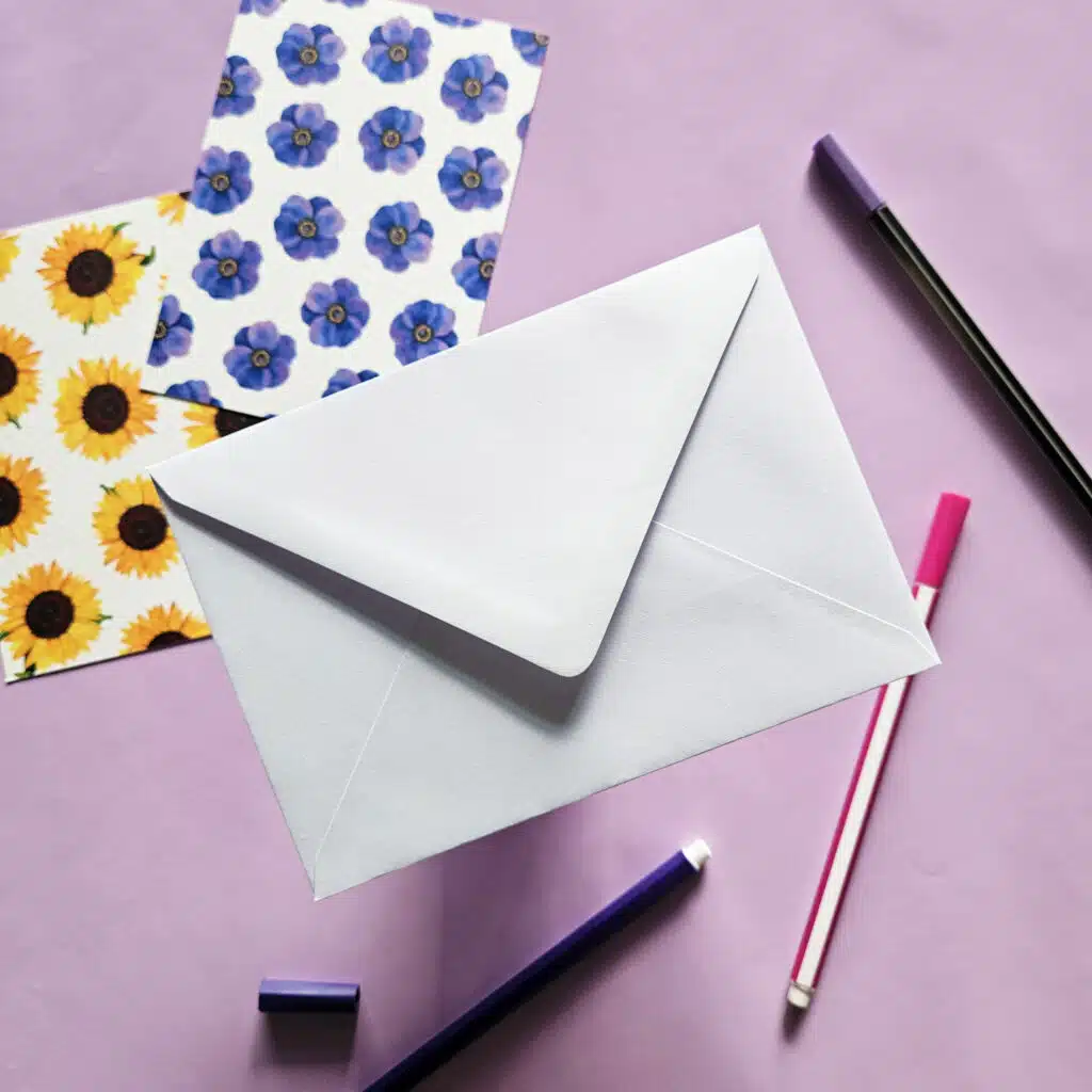 120 grams witte envelop. Gegomde insteekklep. Voor A6 formaat wenskaarten; alle wenskaarten in mijn shop passen in deze envelop.